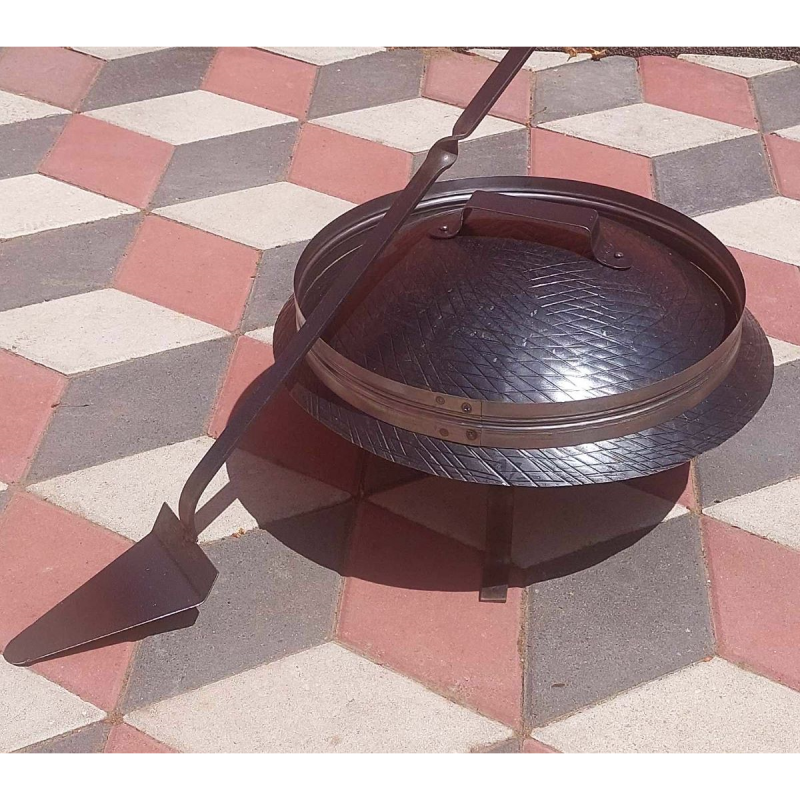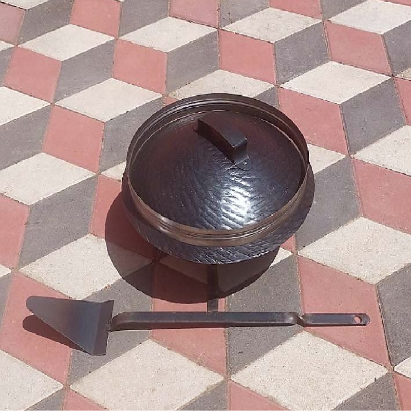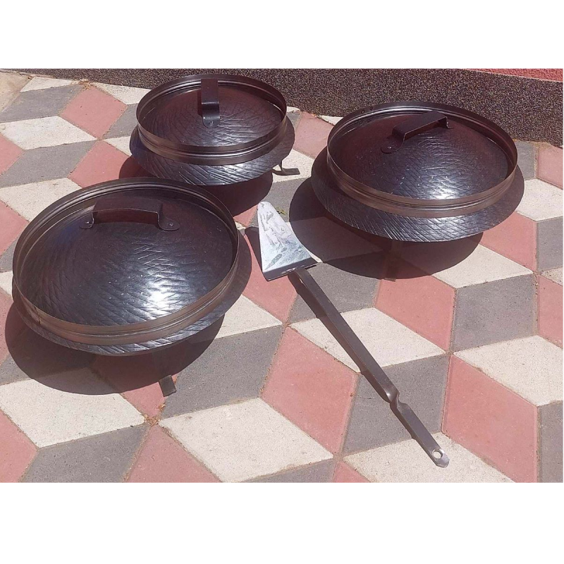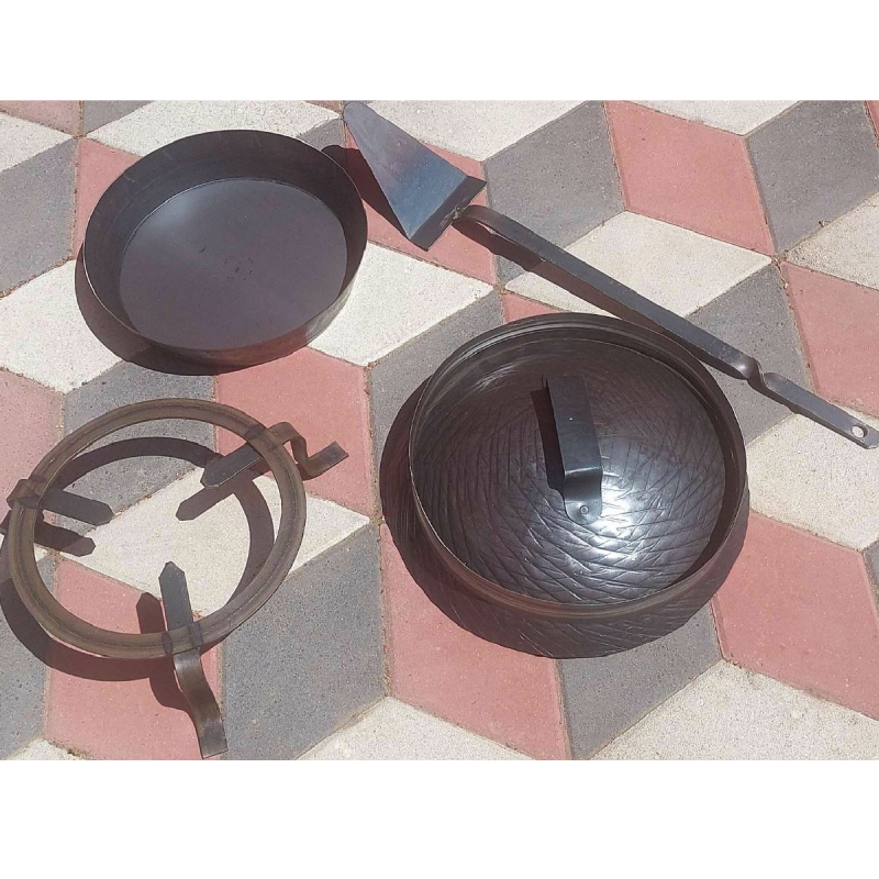 Dobijate sledeće delove: tronožac, tepsiju, poklopac (sač), obruče i mašicu – lopaticu