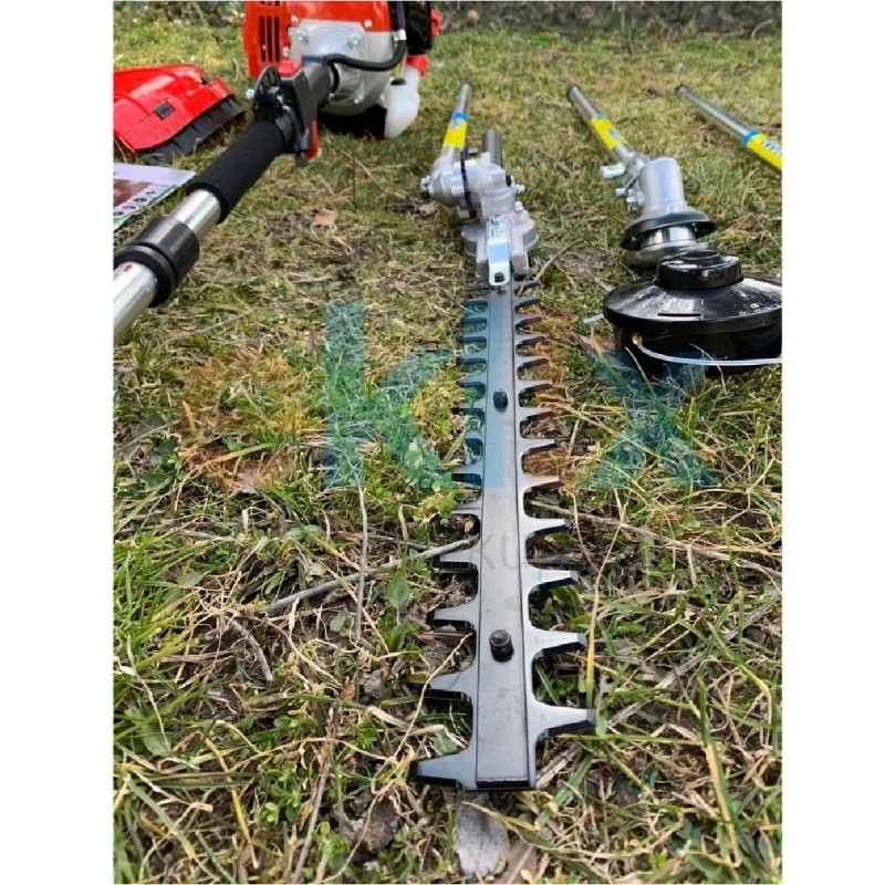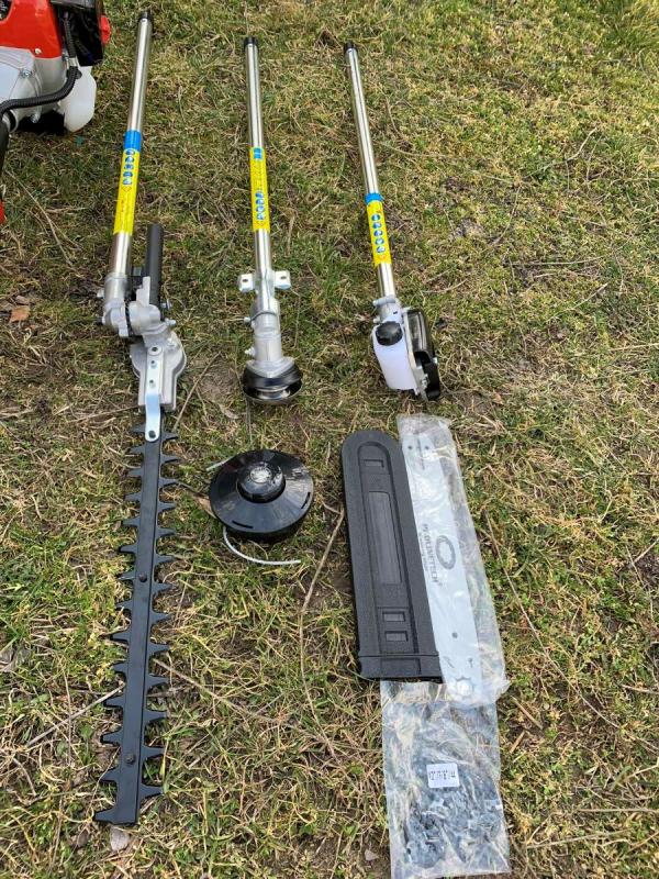 Isporučuje se sa više nastavaka (trimer za travu, trimer za živicu, trokraki nož, testera za orezivanje tanjih grana)