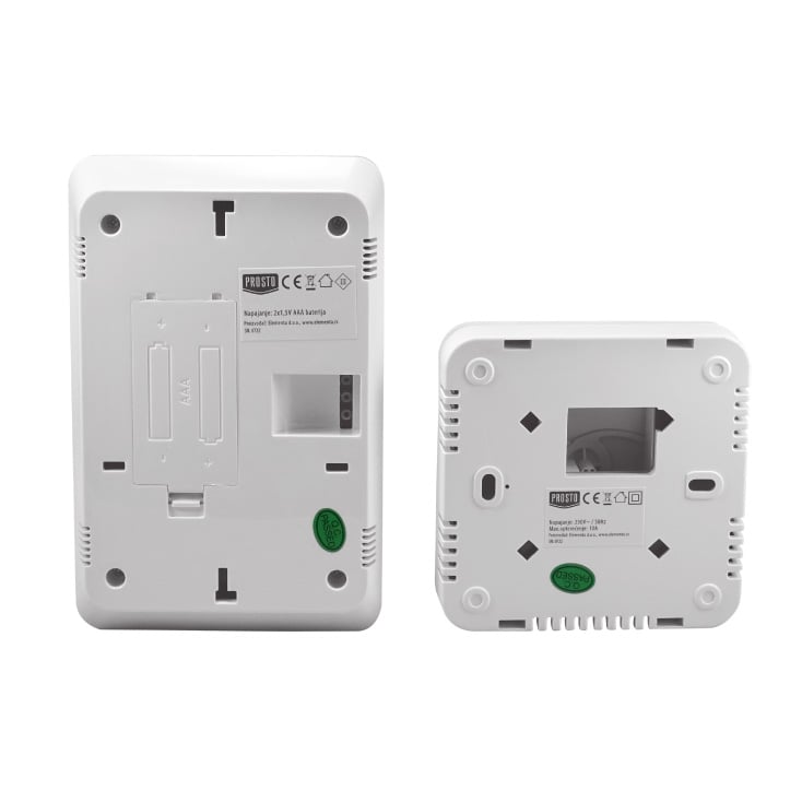 Dimenzije: 135x87.5x23.2 mm (termostat, bez stalka), 86x86x26 mm (prijemna jedinica)