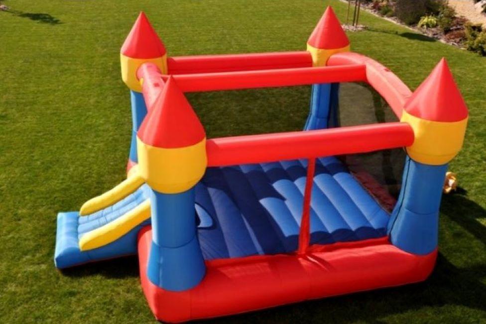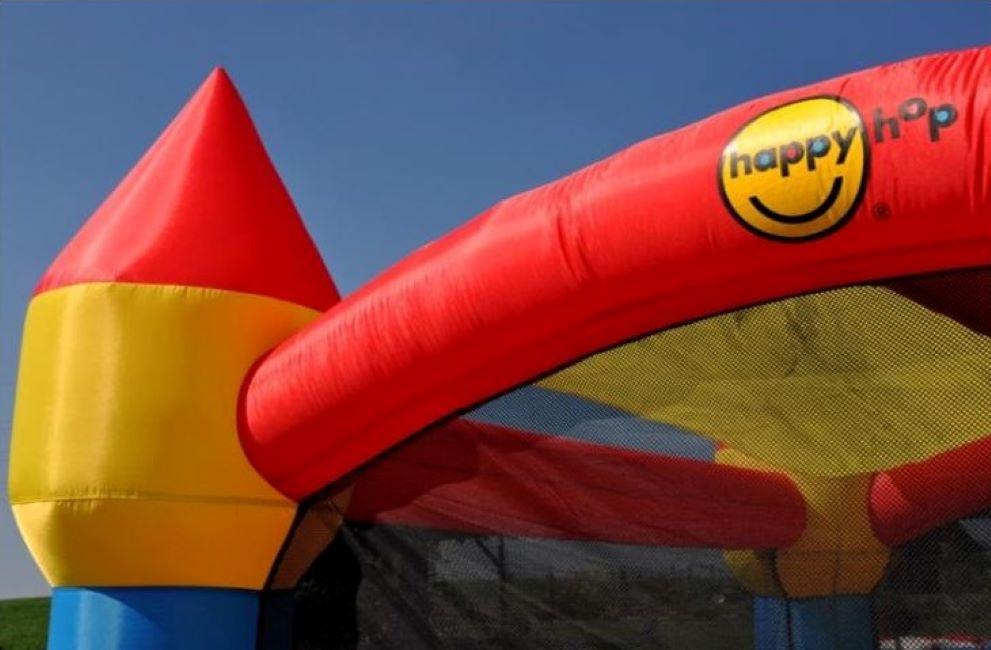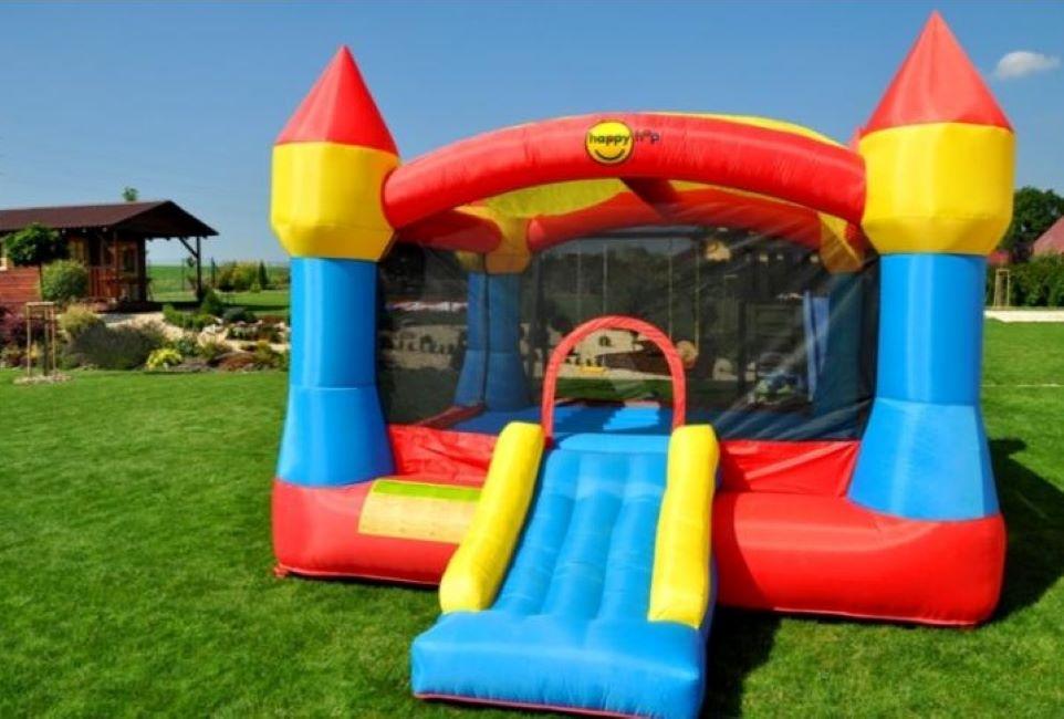 Happi Hop Castle Bouncer sa toboganom i obručem šarenog dizajna podstiče decu da nauče da u skoku ciljaju u obruč.