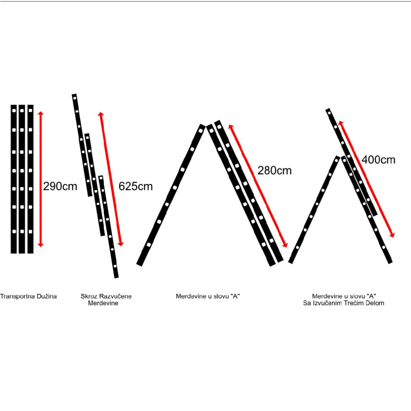 Trodelne aluminijumske merdevine 3x10/ 6,25m sastoje se od 3 dela sa po 10 gazišta